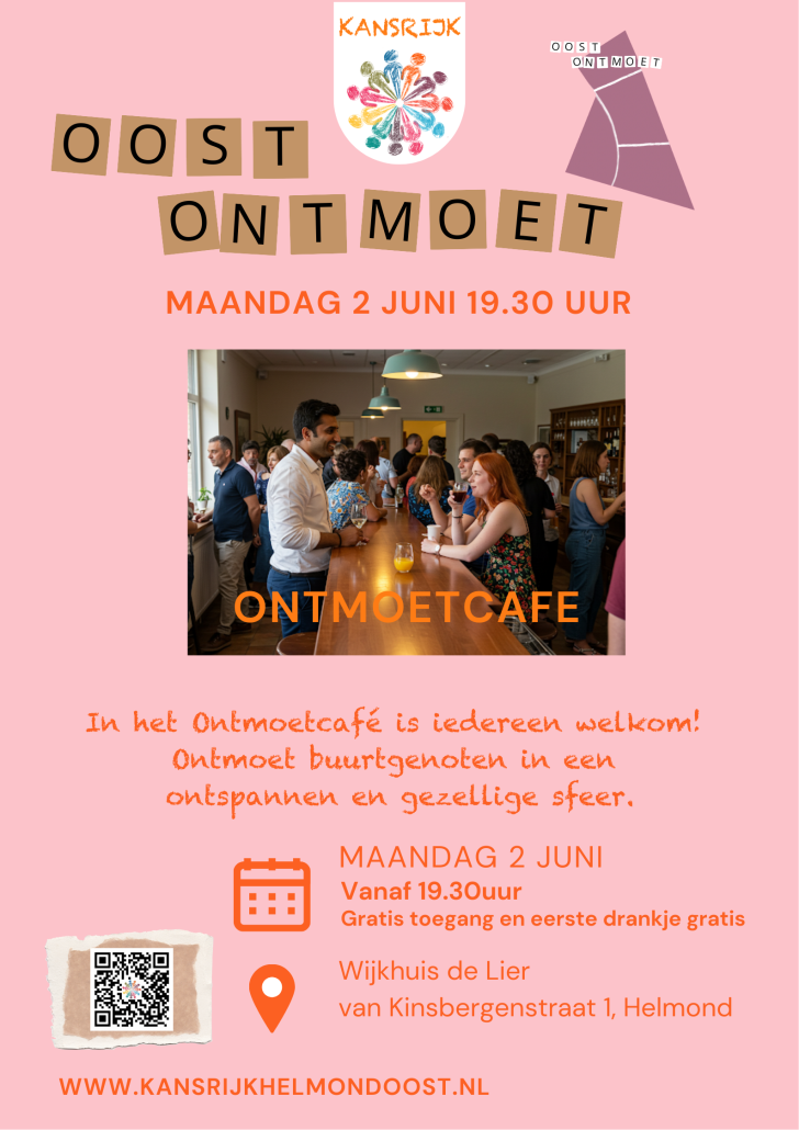 Zin in een gezellige avond in de buurt? Kom op zondag 2 juni naar het Ontmoetcafé van Kansrijk Helmond Oost! Iedereen is welkom om een drankje te komen doen. Het eerste drankje is van ons!